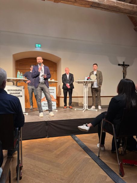 Die Bürgermeisterrunde begann mit einer jeweils dreiminütigen persönlichen Vorstellung der Kandidaten. Johannes Baumeister nutzte diese Gelegenheit, um seine Motivation, seine Eignung und seine Ziele für die Gemeinde überzeugend darzulegen. In der anschließenden Diskussion zeigte sich erwartungsgemäß, dass es bei den politischen Zielsetzungen vergleichsweise wenige Unterschiede gibt. Deutlich wurde jedoch, dass sich die Ansätze vor allem in der Herangehensweise unterscheiden – insbesondere bei Führung, konzeptioneller Tiefe und Kommunikation.