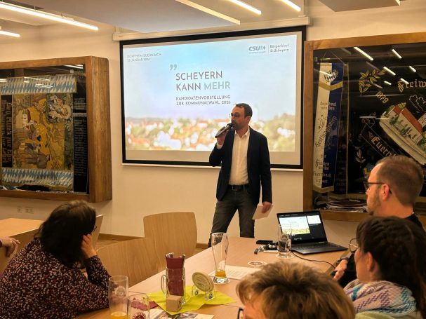 Am vergangenen Freitag stellten sich Bürgermeisterkandidat Johannes Baumeister und das Team von CSU und Bürgerblock Scheyern im gut besuchten Dorfheim Euernbach vor. In seiner Rede nahm Johannes Baumeister eine kritische Bestandsaufnahme der aktuellen Situation in der Gemeinde vor, zeigte aber zugleich die bestehenden Stärken und Entwicklungspotenziale Scheyerns auf.