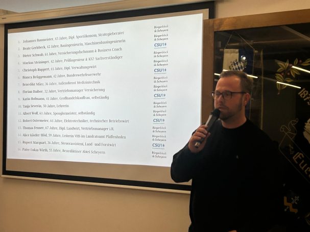 Im Anschluss stellten sich die Kandidatinnen und Kandidaten für den Gemeinderat vor, bevor Landtagsabgeordneter Karl Straub in seinem Schlusswort auf die Bedeutung der anstehenden Wahlen von Landrat und Kreistag hinwies und die Scheyrer Kandidaten Johannes Baumeister, Tobias Ullrich (Junge- und Familienliste) sowie Dieter Schwab (CSU) zur Wahl empfahl.