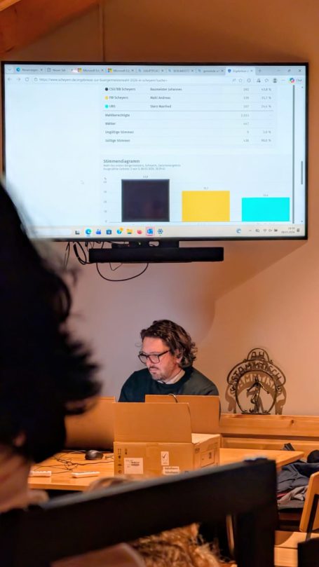 Die Spannung am Wahlabend im voll besetzten Vereinsheim des ST Scheyern war greifbar, als die ersten Ergebnisse eintrafen. Mit der Auszählung des letzten Wahlbezirks war dann klar: Mit 59,6 % der abgegebenen Stimmen wurde Johannes Baumeister zum neuen Bürgermeister von Scheyern gewählt.